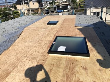 野地板張りのあと、トップライトの取り付けを行い、ルーフィングの敷き込みを行いました。