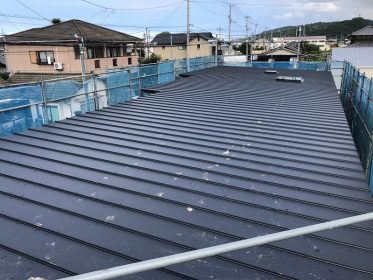 無事、屋根工事、完了しました。今回のお住まいは平屋でしたので、屋根も大きく壮観ですね。