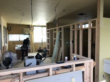 間柱を建て、間仕切り壁や集成カウンター材を加工して受付台などを造作しました。