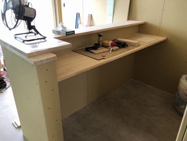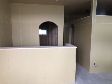 アール型の入口も手間は掛かりましたが、いい感じで仕上がりましたね。来週からは、カウンター材の塗装やクロス工事などの工程を組んでいます。