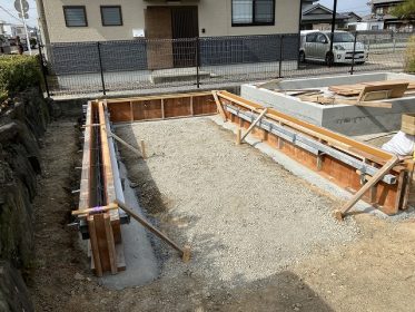 木造住宅に併設して、ガレージ基礎も工事完了です。いよいよ上棟です。すごく楽しみです。