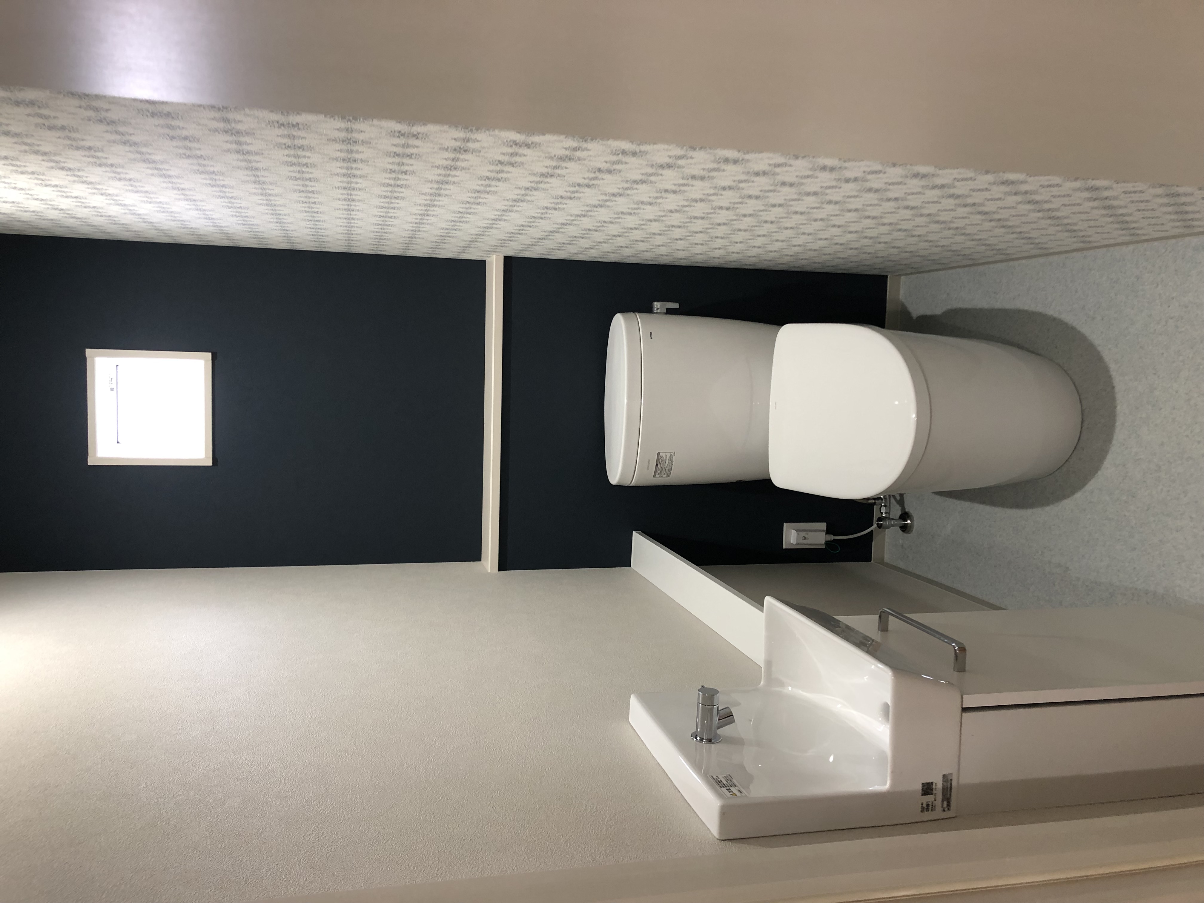 トイレは落ち着いたネイビーのクロスにアクセント柄を組み合わせ、清潔感とおしゃれさを両立。