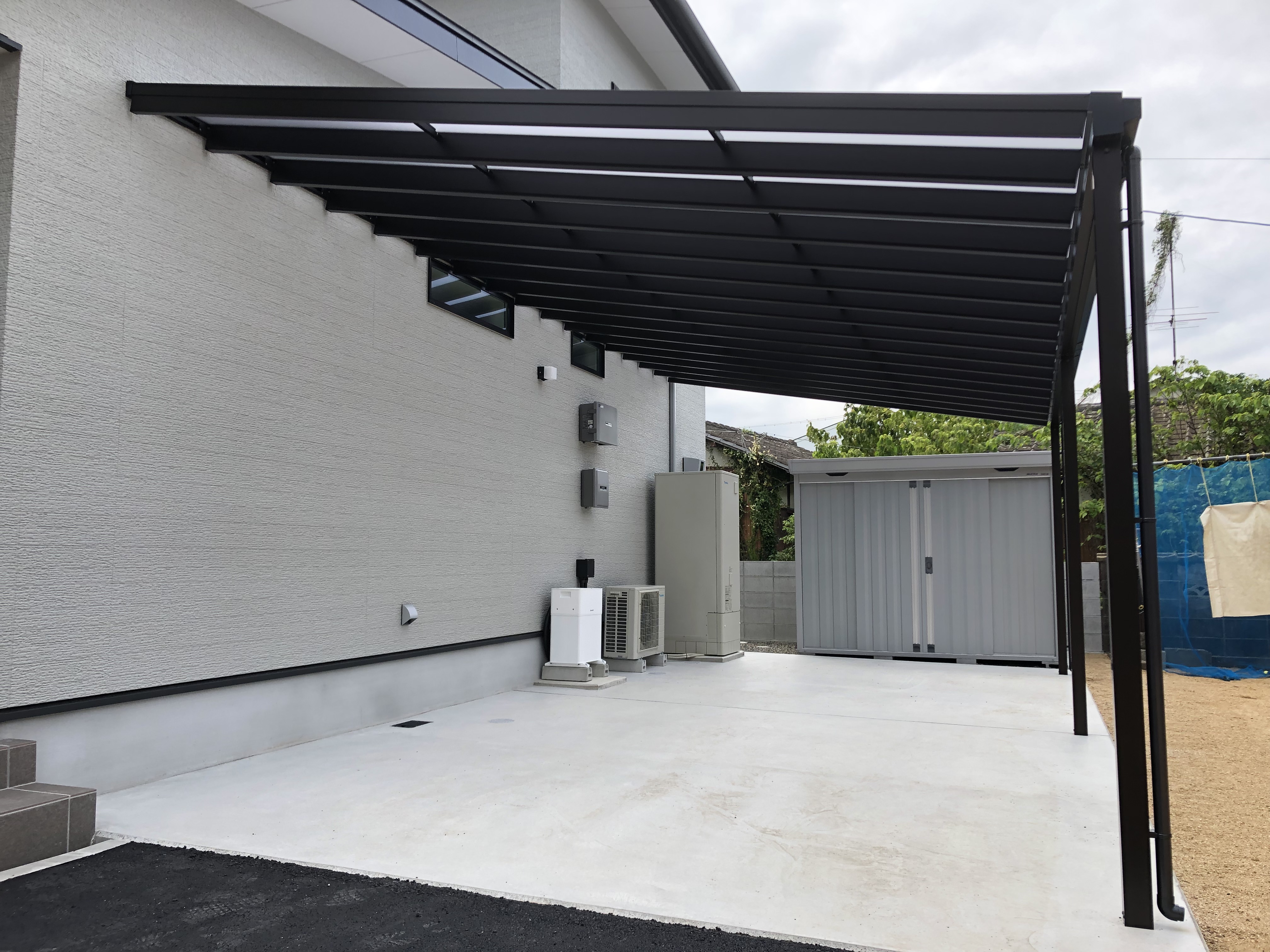 さらに、外部には勝手口から続く洗濯・家事動線を考えた屋根付きスペースや、実用的な屋外シンクも備わっており、日常の暮らしを支える機能性が充実しています。